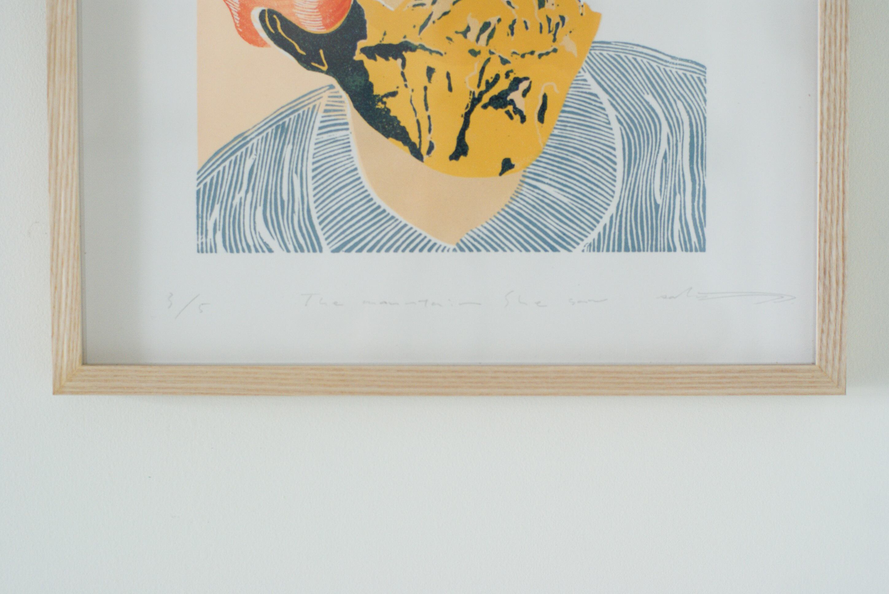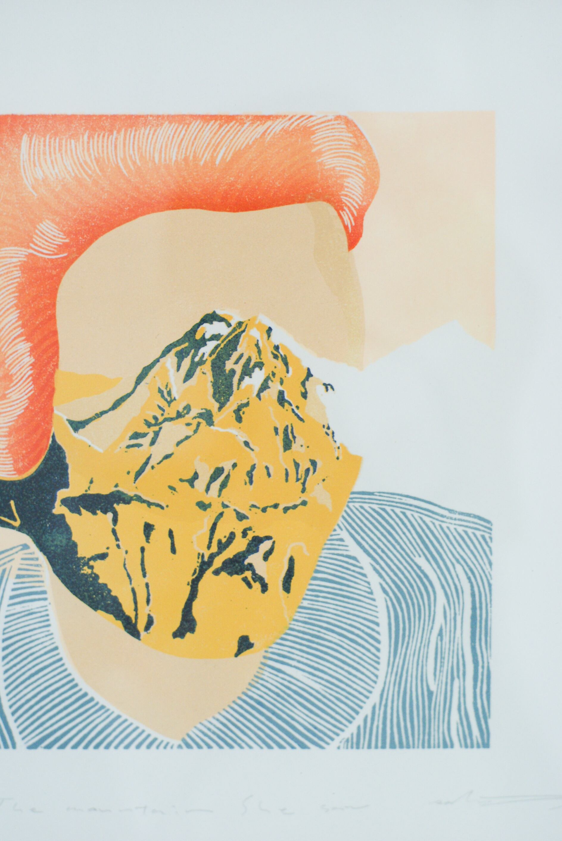 Saki Kitamura creates works rooted in printmaking, often featuring mountains and human figures.