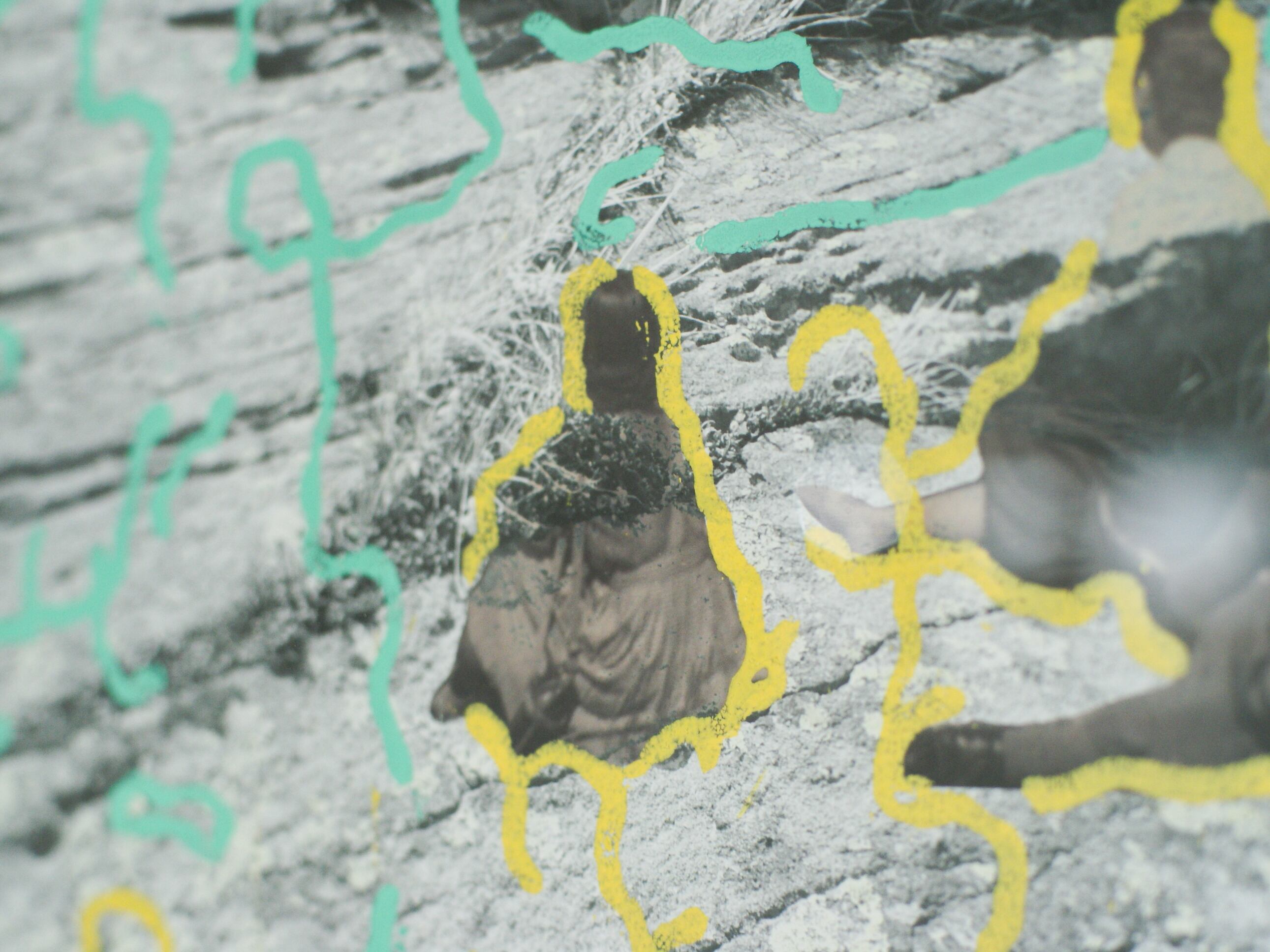 This work combines a photograph of a dark rocky slope taken during a climb of Mt. Amigasa in Nagano Prefecture with a vintage photograph of a family enjoying a picnic and gazing at the landscape from a hilltop. The natural harmony between the perspectives of both images inspired the composition.