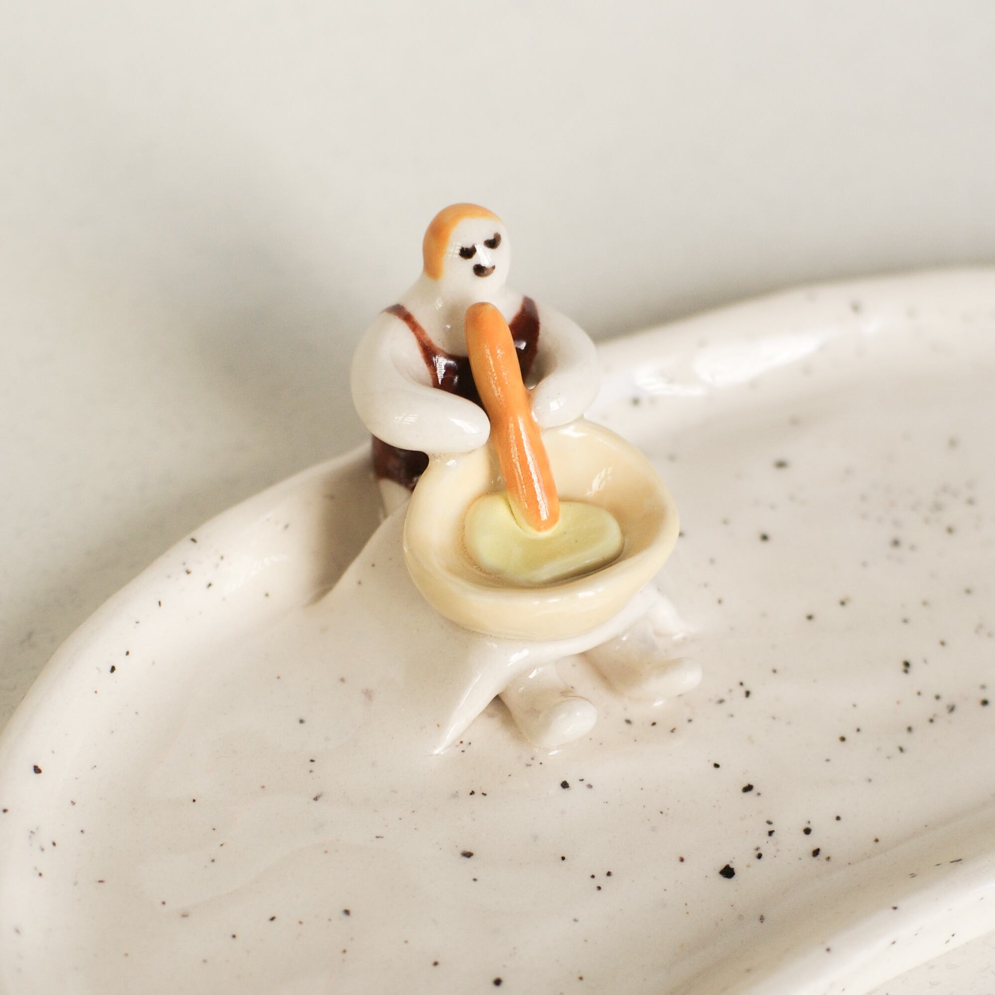 何かを作っているのか、穏やかな表情の人と、小さなバナナ。