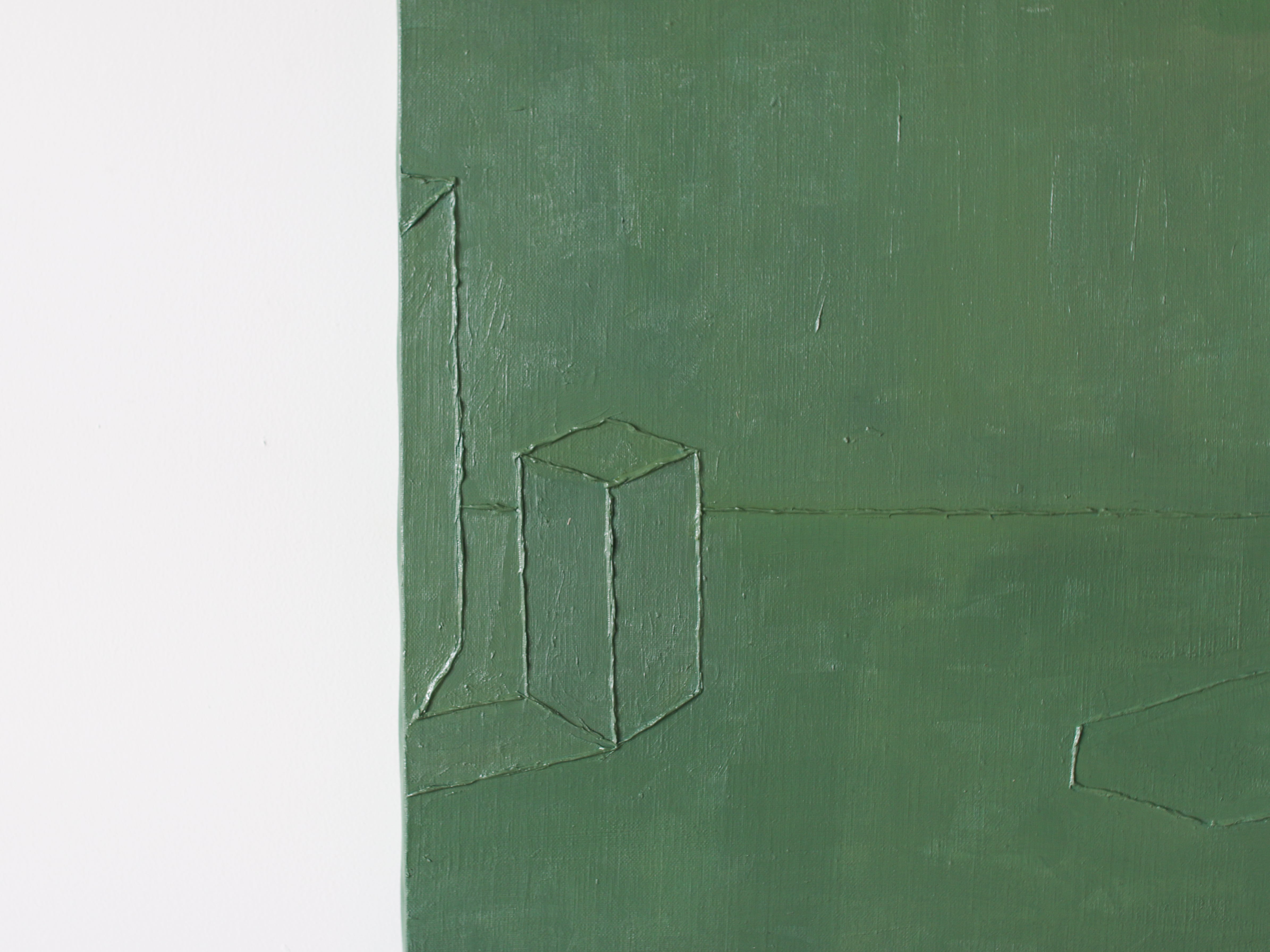 架空の静物画として制作された作品。抽象性のある形体と向き合いながら絵の具を載せていくという作業を重ねていると、異なる時間の流れの中にいるような感覚になる。そしてキャンバス⼀⾯に絵の具が乗ったその時、元の世界に引き戻される。