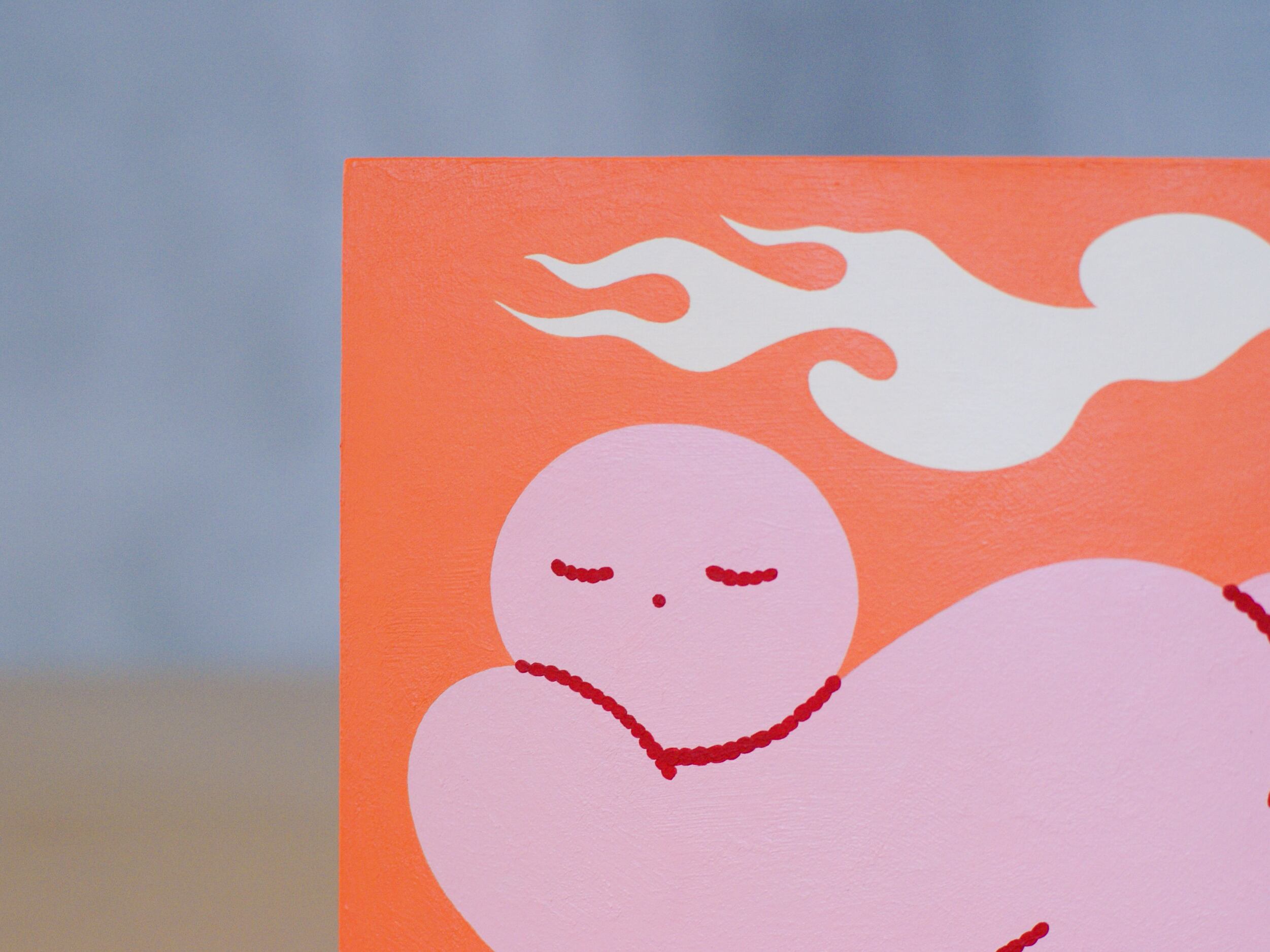Born in Tokyo, 1993. Graduated from Musashino Art University. She began her career as an illustrator and artist in 2020. Influenced by the dance she practiced from childhood, Maeda is interested in physical expression and creates works that freely cross inspiration from things like Buddhist statues and dance. Her works, featuring humorous and open characters, have garnered increasing interest from overseas, and her participation in an art fair in Korea has been confirmed, expanding her global presence.
